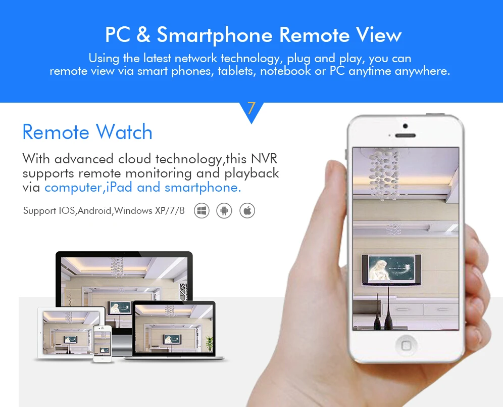 Using the latest network technology, plug and play, you can remote view via smart phones(Android/iPhone), tablets, notebook or PC anytime anywhere.