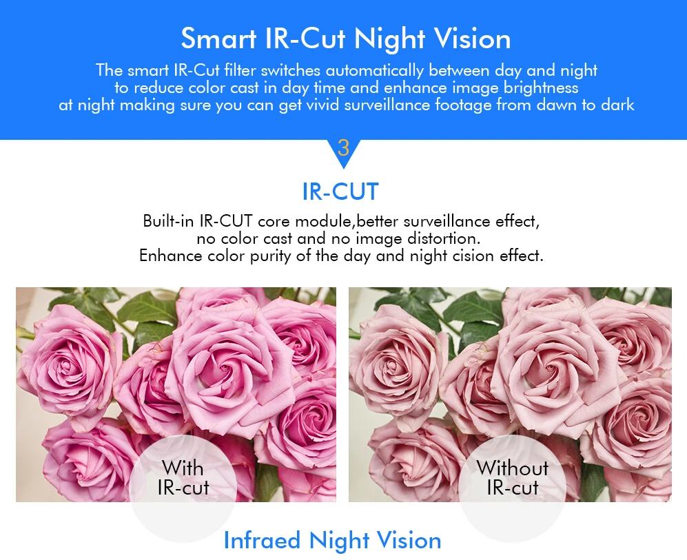 The smart IR-Cut filter switches automatically between day and night to reduce color cast in day time and enhance image brightness at night making sure you can get vivid surveillance footage from dawn to dark