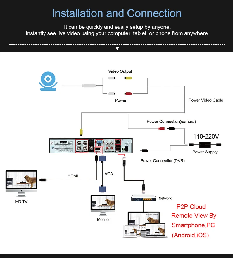 Using the latest network technology, plug and play, you can remote view via smart phones(Android/iPhone), tablets, notebook or PC anytime anywhere.