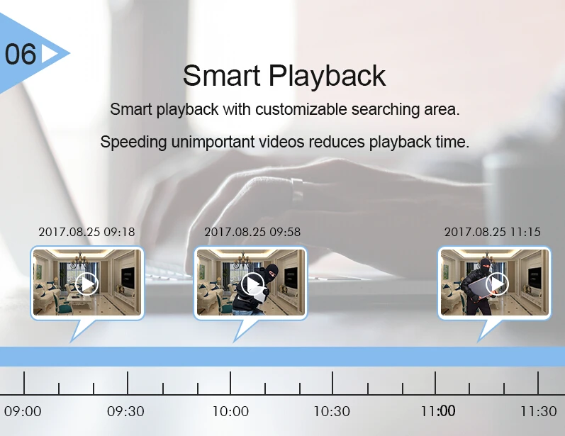Smart playback available with customizable searching area, playback time is greatly reduced by speeding through unimportant videos