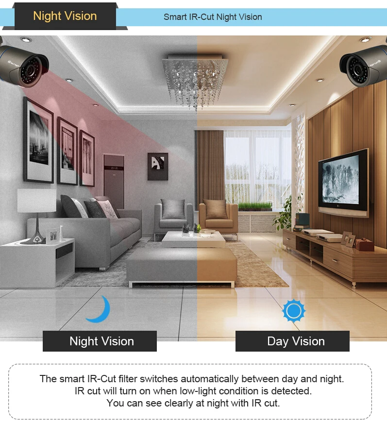 The smart IR-Cut filter switches automatically between day and night to reduce color cast in day time and enhance image brightness at night making sure you can get vivid surveillance footage from dawn to dark