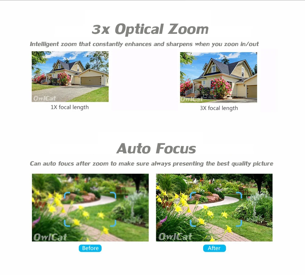On-time Delivery: If you do not receive your purchase within 60 days, you can ask for a full refund before order completion (when you click "Confirm Order Received" or exceed confirmation timeframe).Fantastic Clearance OWLCAT SONY 1080P Mini CMOS Indoor/Outdoor Security CCTV IP Camera PTZ 3X OpticaL ZOOM Auto Foucs Video Network Camera IR Onvif