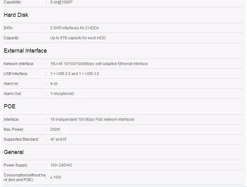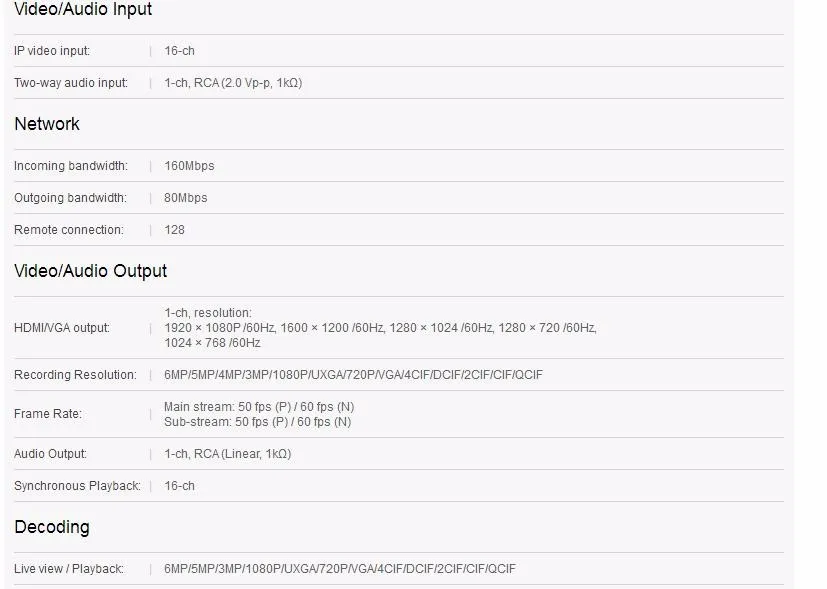 Up to 6 Megapixels resolution recordingHDMI and VGA output at up to 1920×1080P resolution4/8/16-ch network cameras can be connected with 40M/80M/160M incoming bandwidthUp to 2 SATA interfacesPlug & Play with up to 8/16 independent PoE network interfacesSupport network detection, including network delay, packet loss, etc.