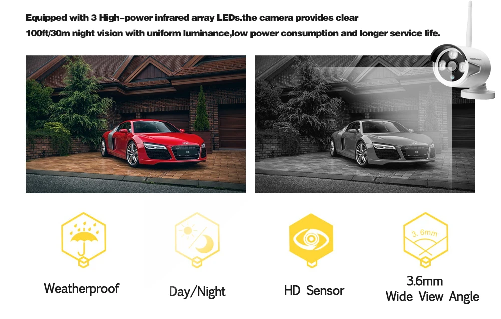 Intelligent auto IR-Cut filter switches between day and night to provide you 24/7 monitoring with high quality images and stunning infrared night vision.