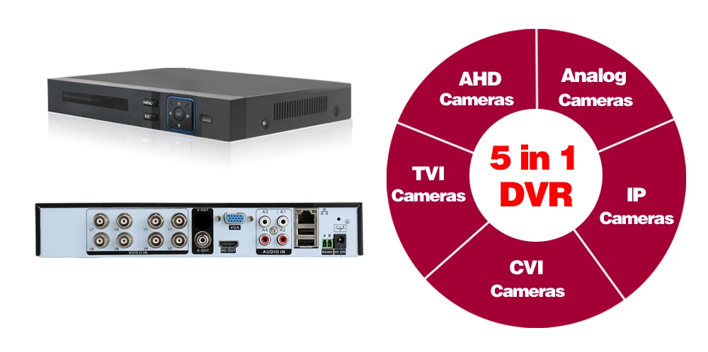 You can freely enjoy five connection modes with this one multi-function digital video recorder.AHD(Analog High Definition)is new advanced technology on home security with 5 recordering modes.for your option:Analog / Network / TVI / CVI / AHD+Network. You can get HD quality video in each mode.