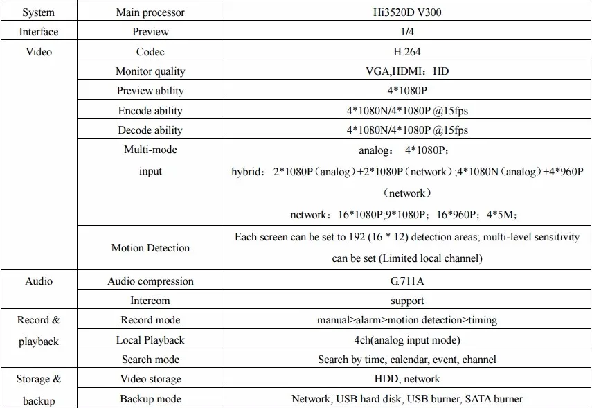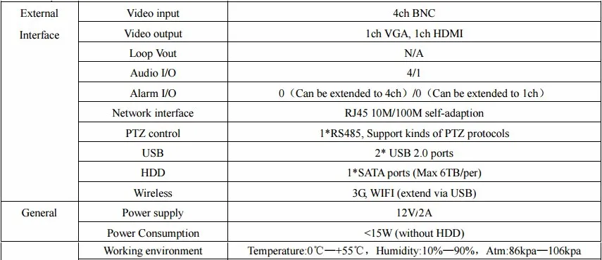The product is very excellent. Seller is very friendly. He can fast in answering my questions. Sellers ship package quickly. The very fast goods come to the address. My spouse and I is pleased with her service.Feature:1,Support VGA, HDMI full HD output simultaneously;2,Support ONVIF; access third party;3,Support multiple cloud technology, network penetration, alarm information pushed to your phone and other functions;4,Support web, CMS, center platform management software MYEYE, provide SDK development;5,Support various mobile monitoring (iPhone, Android);6,Remote Access, With DNS (ARSP),easy to monitor remotely7,Support UTC, control signal& video stream transmit through one single coaxial8,Support AHD/TVI/CVI/CVBS/IP five signals;AHD6004T-MH Specification: